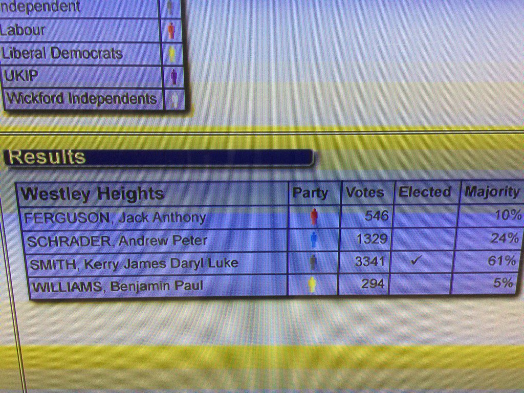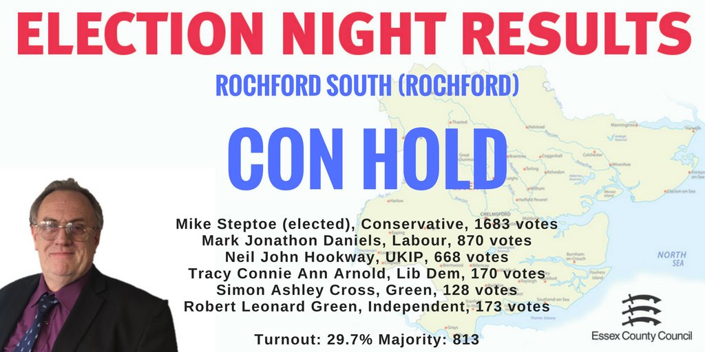 Top of the BBC live feed reporting on the results was the statement: “BBC political correspondent Chris Mason tells BBC Breakfast that there is “loads more to come but the trends are pretty clear – Conservatives will be cheering,” he says and Theresa May may be thinking that “if things carry on like this, I was justified calling the general election”. He thinks Jeremy Corbyn could face “big criticisms” within his own party for Labour’s performance, while UKIP are “really struggling now to define what they exist for”. Meanwhile, a Lib Dem fight back “doesn’t seem to have happened yet“”. Nearer to home there were emphatic wins in Rochford for Mike Steptoe (Conservative) and in Basildon for Kerry Smith (Independent, ex-UKIP), which will no doubt cause local ripples.