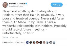 I should reiterate that I do not defend the indefensible and regret if that use of words was made or any intemperate language, partly because the ignorant and Trump haters will see these as tantamount as him being racist and partly because I dislike crassness and making points that can be misinterpreted or are unbalanced. Part of Trump’s charm (or not depending on your views) is he shoots from the hip and says things as he sees them. I have little doubt Trump sees there are good and bad Haitians and that can be said for every country under the sun, and it would be regrettable if as a result of his supposed use of words people see Haitians as mostly bad. I would like him though to use he position to decry all xenophobia.