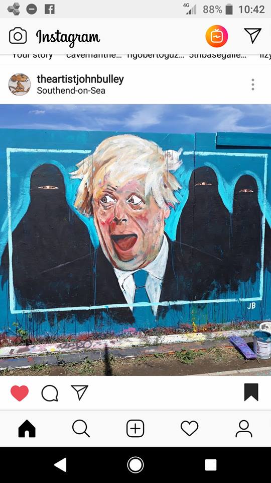 Other than share a picture painted by my street artist friend John Bulley, who claims he neither likes Boris nor the burka, I have resisted referring to specific media accounts, which can be found in great abundance, from many sectors of society, by checking out Google and, in my case, many postings to be found on social media friends (mainly of the liberal left flavor and as expected not sympathetic to Boris). A wide range of opinions have been expressed and it seems everyone has one. I have refrained from giving the link to Boris’ original article as in order to read it you need to subscribe and in order to subscribe you must pay (against my religion).