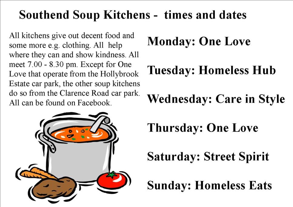 I suppose Southend is blessed by having so many outlets for helping the homeless, including soup kitchens that run for six of the seven nights of every week (details of which are given in the picture). I reflected on this and gave the then state of play over a year ago (see here) and am pleased to note that the soup kitchens are still going strong and serving many guests (60-80 is not an unusual number).