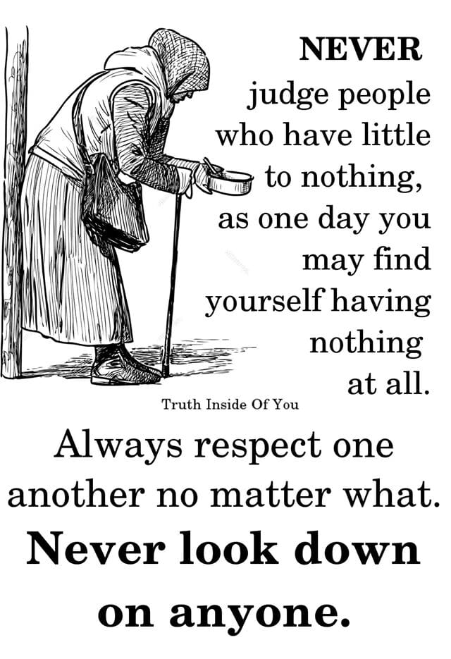 I have a tendency of including a meme in any new blog post, which provides a key note to what I am about to write and hopefully entice Facebook users and the like to read what I have written. The meme that follows fits the bill and is what my barber concluded after recounting a story while cutting my hair yesterday – you cannot judge a book by its cover. A few days previously a homeless man he knew walked into his shop. Two of his customers feared he was a “wrong ‘un” and about to kick off. Instead the man gave the barber a small gift (out of gratitude), exchanged a few pleasantries and went on his way. But today, it is buy one get one free. The second meme is about something I regard as important when dealing with anyone, especially the homeless – showing respect. In a strange, unplanned way the two memes have a common message – not to judge people.