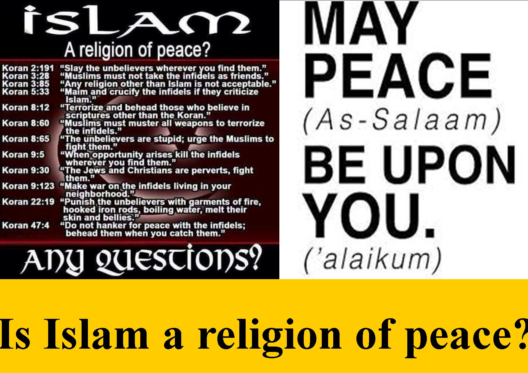 One of my undertakings as I embark on a one month study leave is to read more about Islam, including the Koran, and understand more of the concerns of the critics of Islam, so at least should my Muslim friends take me up on my offer to discuss some of the concerns raised above, I can hold my own. I do so in the spirit of a peace maker, a libertarian, a seeker after the truth as well as being an earnest Christian. Despite knowing a lot more than most, I am no expert on Islam, but I recoil when I listen to ignorant leftie, liberals say how good Islam is, one of the crazy aspects of contemporary culture. This may be contrasted with my knowledge of Christianity. Yet I daren’t claim to be able to speak for all Christians (although I do understand more than most what constitutes authentic Christianity). When challenging the “Islam, religion of peace” narrative, this is something this Christian may identify with, as it is often claimed Christianity is a religion of love. I would argue that while God’s Son dying on a cross for our sins is mighty evidence of divine love, Christianity is also a religion of the holiness of God and before love there needs to be righteousness. I also recognize there are difficult passages in the Bible, e.g. God calling the likes of Joshua and Saul to slay whole cities, and these have been used by some who in the name of God have down the ages done outrageous things. The meme I present here illustrates two sides of the coin that need to be recognized in honest discourse. In doing so, I acknowledge due to repercussions my Muslim friends may feel less free to criticize members of their own religion than I would of mine.