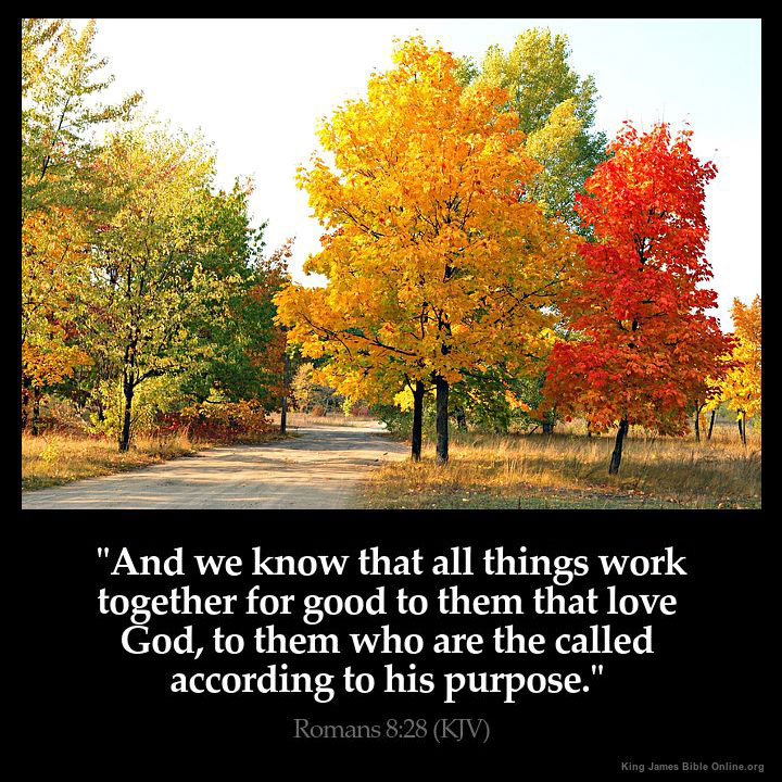 So it is back to our text, which like many texts in the Bible can easily be taken out of context. Considering words at face value though: “all things” means all things; “work together for good” incredible as it seems means just that; “them that love God” refer to them that love God. “them who are the called according to his purpose” tells us there is a purpose behind it all. While not always obvious, especially at the time, we need to hold the faith for it wins through in the end.