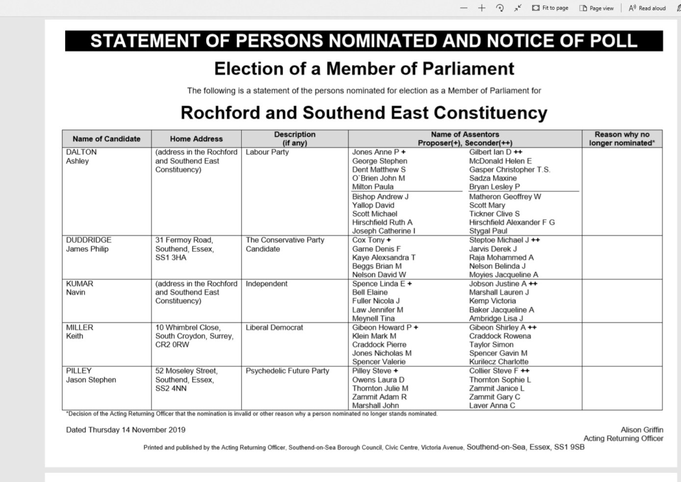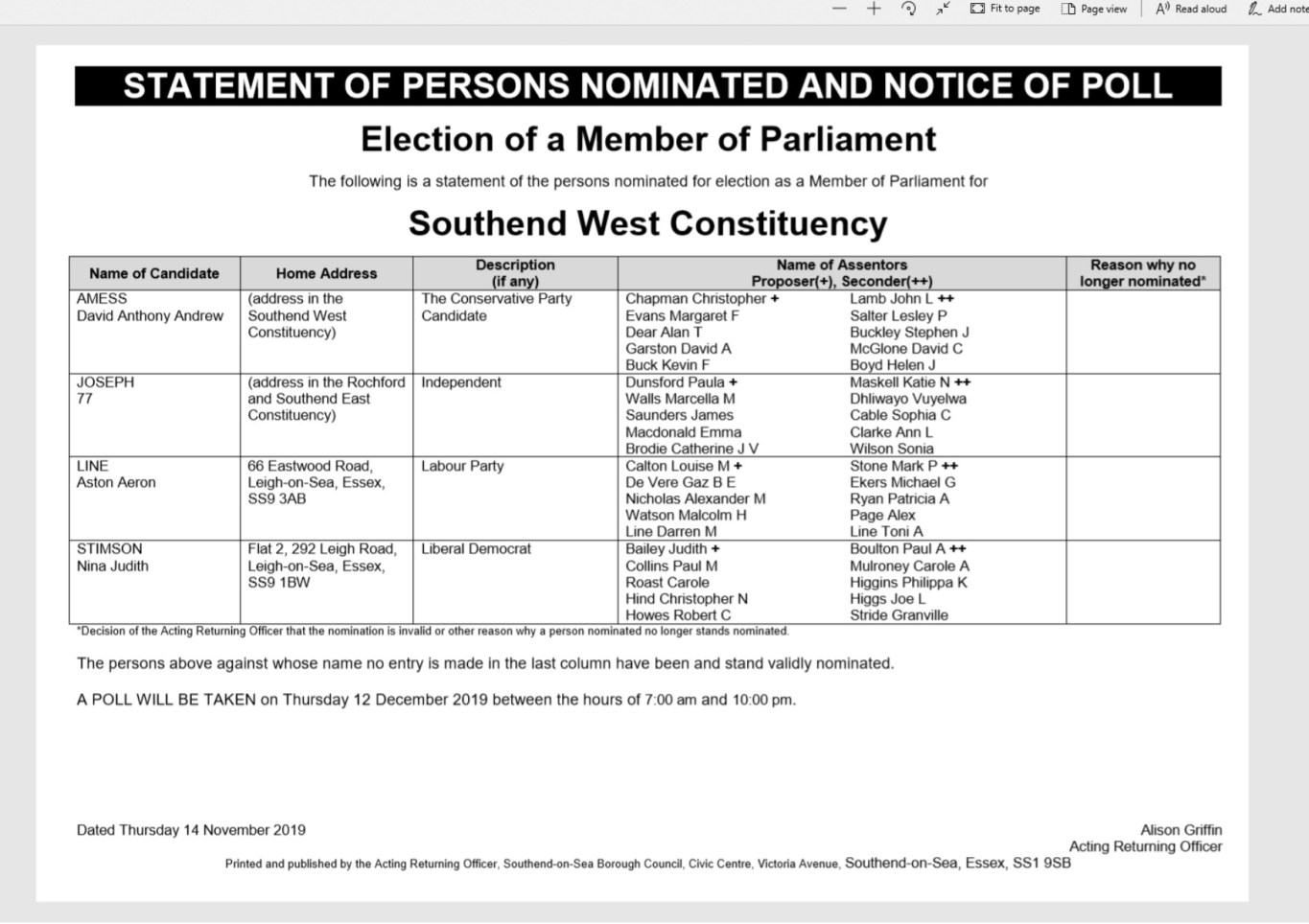 With the deadline for becoming a a candidate last Thursday, we now know who will be standing in the two Southend constituencies. But let me first make some general observations. We see here clear evidence of the two pacts: Remain and Leave. Remain is a two sided pact and the absence of Green Party candidates, while no doubt disappointing local Green activists, will at least give the LibDems, who usually do a lot better than the Greens, a better chance of winning, which I reckon is still a remote one. The East LibDem candidate is new to standing and the West candidate stood in 1992 and 1997, but as they are new to me it is difficult to comment. The Leave pact is one sided and as expected the two sitting Conservative MPs are unopposed by candidates from the Brexit Party. Giving the one-sided nature of the Leave pact, we know the Brexit Party will contest all seats not currently held by the Conservatives. I think Boris has missed a trick. He is wrong and foolish not to do a deal with the Brexit Party as certain marginal seats he may have hoped to gain he may not do so due to a split Leave vote. The final other general observation is there are Independent candidates in each of the Southend constituencies. I know nothing about either of them and don’t expect them to make much impact, so will say no more.