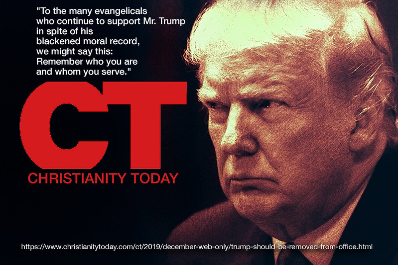 I often find useful reports, on social media, from Christianity Today, that I follow with interest because it informs me on what is happening in the culture at large and how some, often influential, Christians are reacting to these. Most recently, it has come to the notice of mainstream media and it has invited strong reaction because of its editorial: “Trump Should Be Removed from Office – It’s time to say what we said 20 years ago when a president’s character was revealed for what it was”. Given MSM’s antipathy toward Trump it is little wonder they are intrigued and welcoming of this reaction from what is often seen as a member of his evangelical support base, as evidenced in this CNN interview. As for the evangelicals themselves, support for and opposition to the views expressed in this article can be seen among the normal suspects; who can say which group provides the majority opinion?