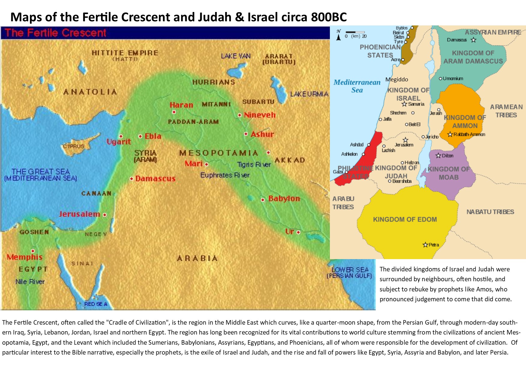 I chose the Fertile Crescent since as well being the cradle of earliest civilizations and including where Abraham hailed from – Ur, it also encompassed the main power bases of the next 200 years: Syria, Egypt, Assyria and Babylon and not long after and (not shown) Persia. Not covered in the Old Testament historical narrative were Greece and Rome, both of which were beginning their rise to power and would play important parts in the history of Israel, which was the main focus of the Old Testament. I wanted to highlight key centres on the map: Jerusalem (Judah), Samaria (Israel), Damascus (Syria), Nineveh (on the banks of the River Tigris – Assyria – now where the northern Iraq city of Mosel is sited) and Babylon (on the banks of the Euphrates and the main city of the empire that bore its name). The maps include important centres spoken off in our narrative, e.g. Bethel, Megiddo and Jaffa (Joppa) as well as the nations that surrounded Israel and Judah: specifically Syria (Aram), Phoenicia (Tyre), Philistia (Gaza), Edom, Ammon, Moab, all of which were prophesied against by the prophet Amos.