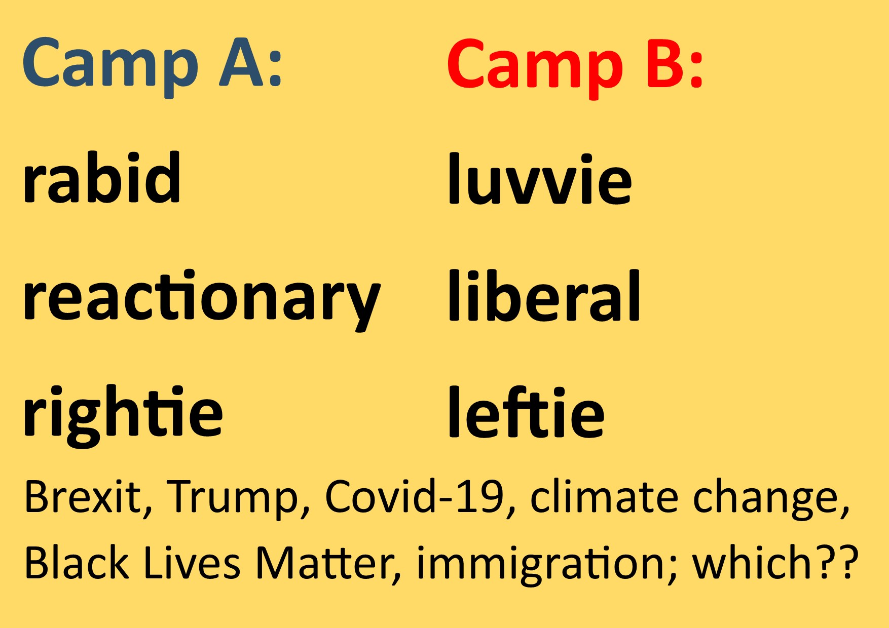 In the early days it often seemed to be about the “rabid, reactionary, righteous, rightie” types being in conflict with the “luvvie, liberal, looney lefties”. Often, despite disagreements, members of the respective groups “got on” but as the culture wars have become fiercer I am finding that is now becoming less the case. While I thought I was somewhere in the ideological centre, given my community activist mantra and support for the underdog, I found that more often than not I sided with the first group, which I will call Camp A, as opposed to the second group, which I will call Camp B. Since then, many issues have occupied peoples’ minds and got some worked up and wanting to back their views and oppose those who argue differently, such as over Brexit and Trump and more recently how to respond to Covid-19 and conspiracy theories, and subjects like climate change, Black Lives Matter and immigration. Then there is hovering around all this the debates regarding whether the way to go is conservatism and nationalism or socialism and globalism.