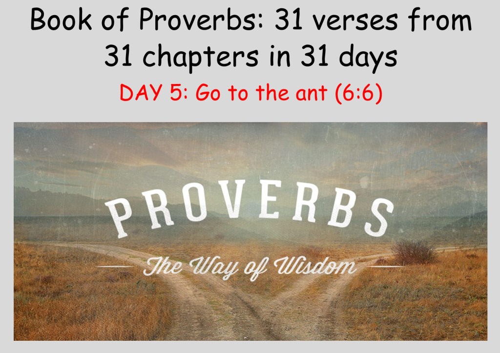Prayer: Thank you Lord for the example of the ant. May we follow this rather than that of the sluggard. There is so much that needs to be done here on planet earth and we need to be smart, diligent and hard workings. Help us to so do.