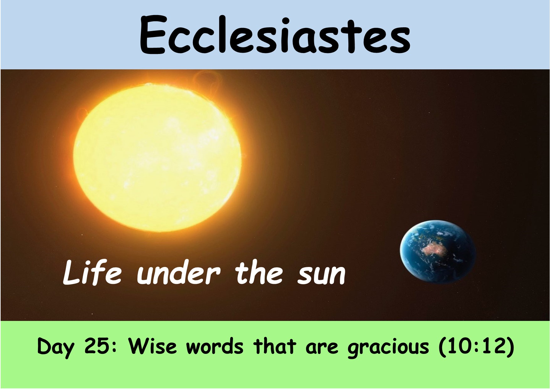 We return to wisdom and why it is superior to folly. “The words of a wise person are gracious. The talk of a fool self-destructs – He starts out talking nonsense and ends up spouting insanity and evil. Fools talk way too much, chattering stuff they know nothing about. A decent day’s work so fatigues fools that they can’t find their way back to town.” (10:12-15 MSG.) It is a beautiful thought that is sometimes missed that, when a wise person speaks, these are gracious words and how much these are welcomed and needed. It reminds us of when Jesus spoke at the synagogue in Nazareth: “And all bare him witness, and wondered at the gracious words which proceeded out of his mouth. And they said, Is not this Joseph’s son?” Luke 4:22. The wisest person to have lived was ever gracious: “A bruised reed shall he not break, and the smoking flax shall he not quench” Isaiah 42:3 and “The Lord God hath given me the tongue of the learned, that I should know how to speak a word in season to him that is weary” Isaiah 50:4. How much the example of the wise contrasts with the empty words of the fool and not just words but their destructive whole way of life. The world is crying out for wise people and their gracious words, just as much as it cries out against foolish people and their “mischievous madness”. May we be found among the gracious wise.