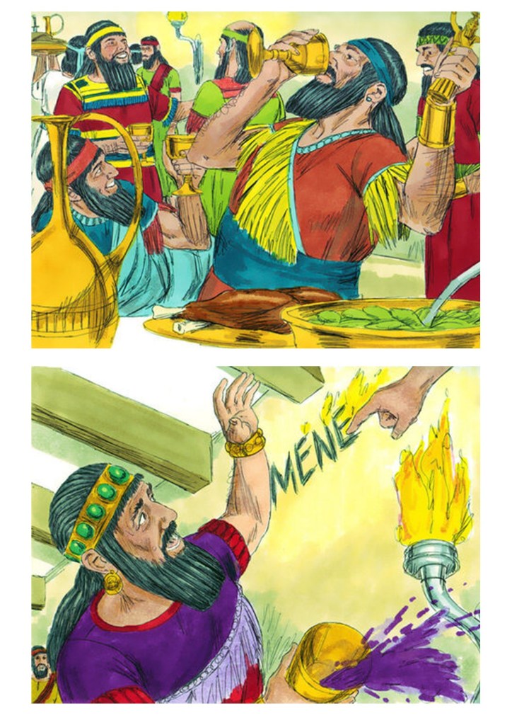 Mene, mene, tekel, upharsin (ˈmiˈni miˈni tɛkəl juˈfɑrsɪn ) was the writing on the wall that followed Belshazzar’s Feast, interpreted by Daniel, the Hebrew prophet, to mean that God had weighed Belshazzar and his kingdom, had found them wanting, and was about to swiftly destroy them and it was done so by stealth, by diverting the river, as the Persian army entered and conquered impregnable Babylon that very night (read all about it in Daniel 5) and it was to mark a turning point in Israel’s history as their 70 years in exile came to an end and they would be free to return home under the decree of Persian King Cyrus.