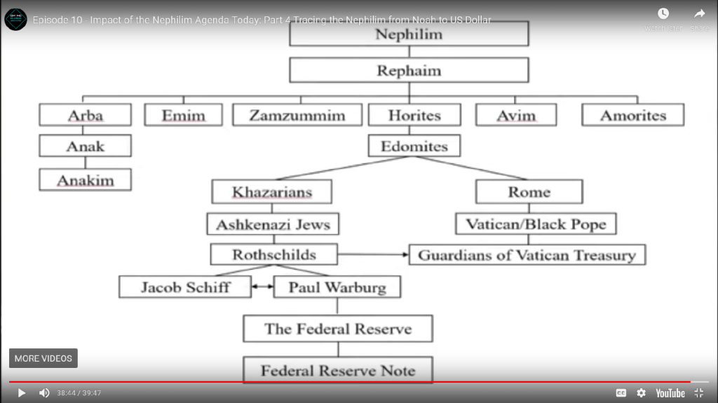 In her presentation, she makes the point that the effects of evil passes from generation to generation and create an atmosphere that permeates throughout the generations, and where she introduces the notion of the Nephilim host. As she brings out, the Federal Reserve, which began in 1913, is a private entity and a corrupt system that holds huge sway over the US/world economy and can print money at will (i.e. not gold backed etc.) and can lend it at interest. She argues it benefits the evil cabal that happens to be Nephilim related and one of its “fruits” is to bring greater humanity into debt slavery, all of which is part of Satan’s plan all along.