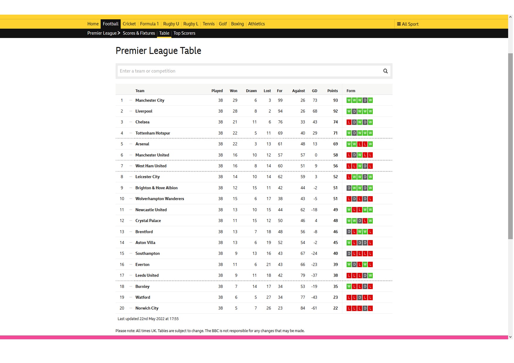 Today’s BBC Sport headline “Title, top four and relegation to be decided – Premier League set for dramatic final day” reading “Will Manchester City or Liverpool be champions? Can Tottenham seal a Champions League spot ahead of north London rivals Arsenal? Which of Burnley or Leeds are heading for the Championship? …” is an intriguing one. I write this around 0900 today, in the knowledge that by 1800 we will have the answers!