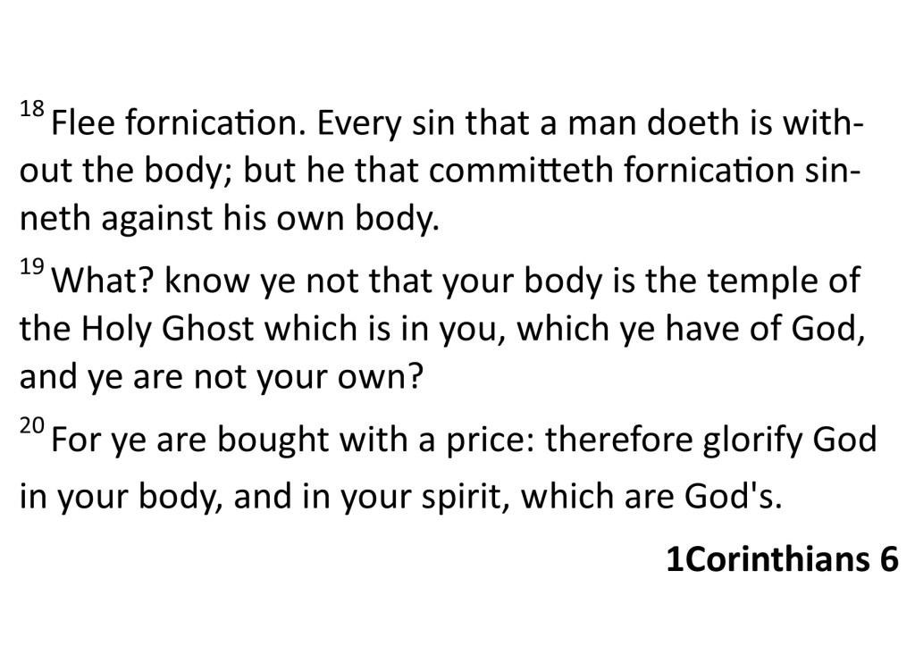 From our text, it is quite clear – “flee fornication” for sexual immorality is a big deal. Of course, there are other things we out to do / not do, given we are reminded in the next verse that our “bodies are temples of the Holy Spirit”, and in the verse after that “we are brought with a price” and we need to “glorify God in our bodies”.