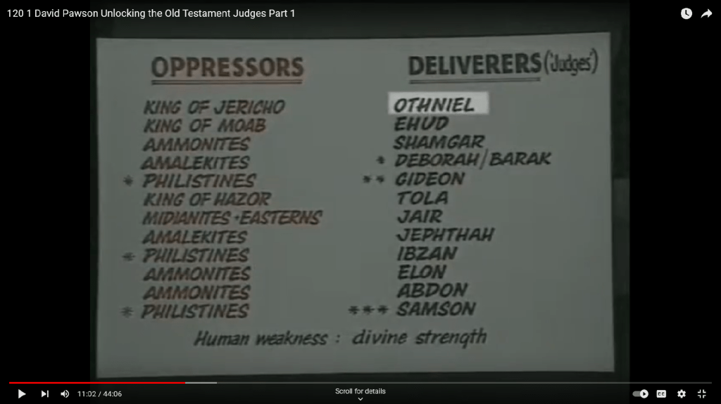 As with our Joshua thoughts, we will try to be succinct and won’t detail the content of the Book of Judges. The story bridges that gap between Joshua and possessing the land and the time of the kings (Saul onwards). It is indeed the story of inexcusable compromise, incorrigible conduct and inevitable corruption, with periods when Israel cried to God for help and He gave Israel these unlikely trouble shooters to deliver them from their oppressors and bring in a period of peace and stability, with this cycle repeated several times.