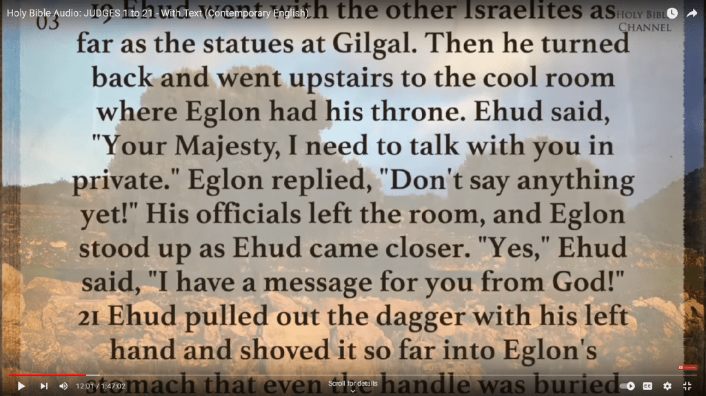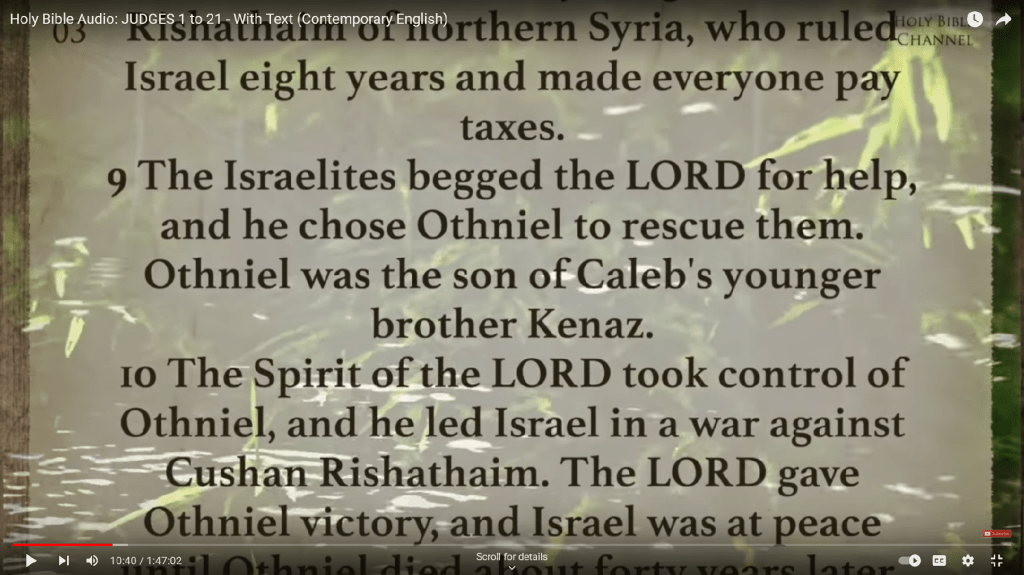 In terms of lessons learned, there are many, not least that this book (tradition has it, written by Samuel) is a warning for future generations of Israelites of what happens when the forsake their covenant with YHWH. For Gentile Christians today, we can reflect on the character of God who judges righteously but also has mercy and is not to be trifled with. While much of Judges makes dismal reading (what happens when God is shunned), it is worth considering the next book (the third in our trilogy) Ruth (part of Judges in the Hebrew Bible), which is a thrilling account of God’s wondrous dealings with Ruth, Boaz and Naomi, and that of the last judge, Samuel, who anoints two kings: Saul and David.