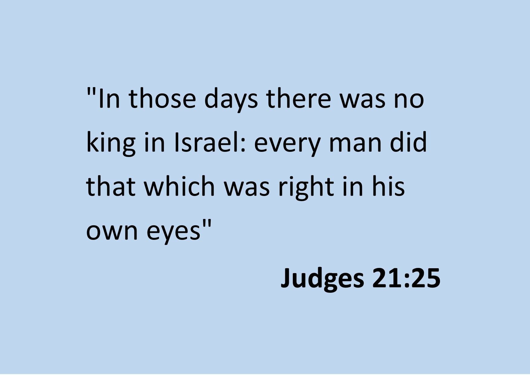 The last five chapters of Judges do not involve Judges but tell two stories involving priests (Levites), who rather than acting as spiritual leaders in the good sense (as was meant to be), do so in the bad sense. We note a strangely modern relating phenomenon of people gravitating toward false religion and avoiding the true. Both are harrowing stories. It would be difficult to know how to tell these to Sunday School children, having the luxury of picking good bits from the likes of Gideon and Samson. In the first, the main sin was idolatry and in the second it was sexual immorality – what were to be reoccurring themes. We are reminded that God put them there for a reason, showing what happens when people turn from God. The final verse is a salutary reminder of what was taking place.