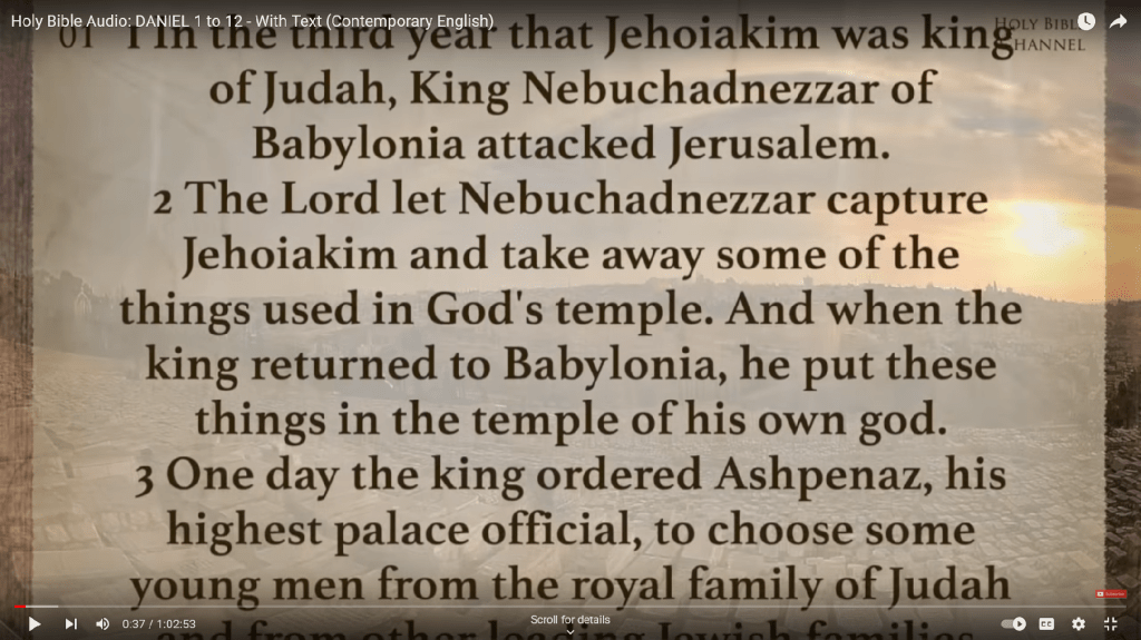 There are many lessons we can take away, not least from the life of Daniel, discussed in “Prophets of the Bible – Daniel”. As we look upon the kings of the world today, we are reminded however dire things appear, how little we know, e.g. distinguishing good from bad, God is in control and this small extract we read of Israel’s history was exactly as God said it would be. We can follow Daniel’s example (and that of his three friends) to be faithful worshippers of God, unafraid to say things as they are. We can also take heart that God is working His purposes out. His plans and purposes cannot be thwarted and He does use, raise up, depose and change kings.