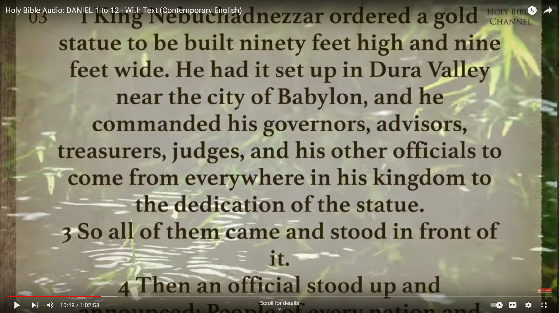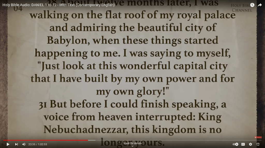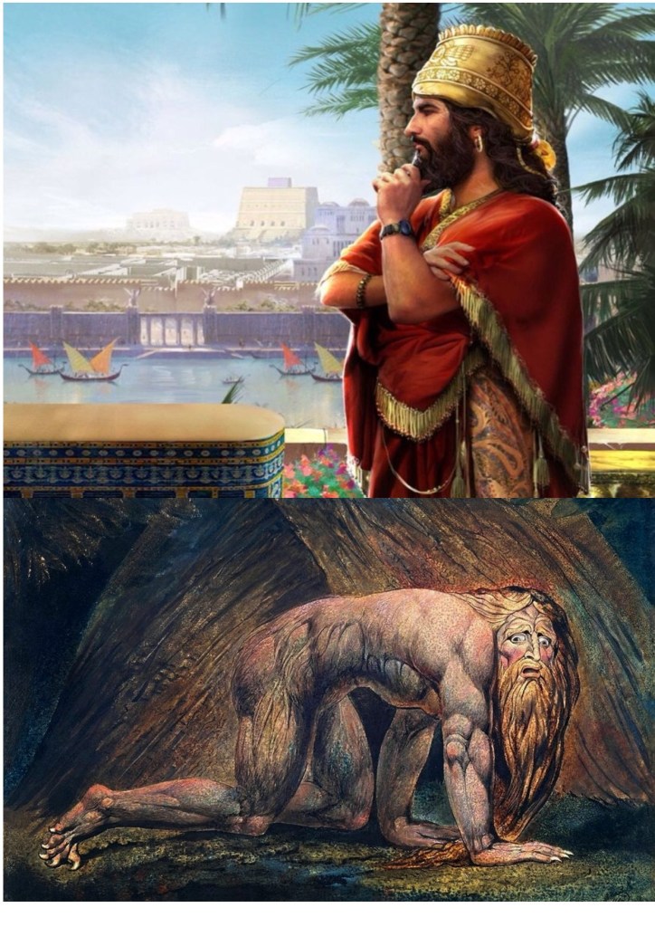 We should remind ourselves that Nebuchadnezzar was probably the most powerful man on the planet during his reign. He had conquered both Assyria and Egypt, the empires that were Israel / Judah’s greatest opposition, and also Judah (the ten tribes of Israel had earlier been conquered by Assyria). He was also responsible for some remarkable projects (discussed in our links, not least one of the seven wonders of the ancient world – the Hanging Gardens of Babylon) and, from a human perspective, could take pride in all his achievements. While often depicted as a cruel ruler, he could also show generosity and the Judean exiles in Babylon lived in relative peace. He selected four young Judeans: Daniel and his friends Shadrach, Meshach and Abednego, whose talents were recognised, to serve in his government, and they did so with much credit. They were also God-fearing men, who would not compromise their faith.