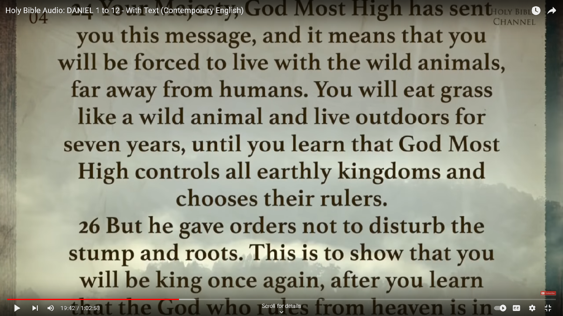 In this chapter we see Nebuchadnezzar proud in his position and achievements but God revealing through a dream, which again Daniel interpreted, that He needed to humble himself, or He will experience calamity. Daniel’s warning “Wherefore, O king, let my counsel be acceptable unto thee, and break off thy sins by righteousness, and thine iniquities by shewing mercy to the poor; if it may be a lengthening of thy tranquillity” (4:27) was ignored and 12 months later he heard the words “O king Nebuchadnezzar, to thee it is spoken; The kingdom is departed from thee. And they shall drive thee from men, and thy dwelling shall be with the beasts of the field: they shall make thee to eat grass as oxen, and seven times shall pass over thee, until thou know that the most High ruleth in the kingdom of men, and giveth it to whomsoever he will” (4:31,32) and so he lived for seven years. But there was a wonderful turnabout in fortunes as Nebuchadnezzar’s mind was restored to him as he recognised the one true God was YHWH who was to be honoured, with his kingdom being restored to him.
