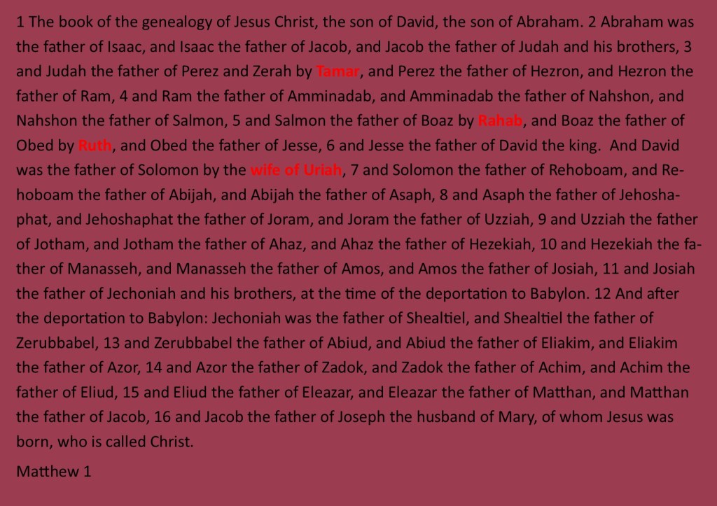 There are differences in the accounts, principally in the Matthew account the Jesus line begins with Abraham, thus emphasising His Jewish roots, and in the Luke account it goes all the way back to “Adam, the son of God”, making the point Jesus is for both Jews and Gentiles. It is well to note that four unlikely women appear in Matthew’s account, but not Luke’s. Other significant differences include the line from David being traced through his son, Solomon, in Matthew, and his son, Nathan, in Luke. Further consideration of why the differences is outside the scope of this account.