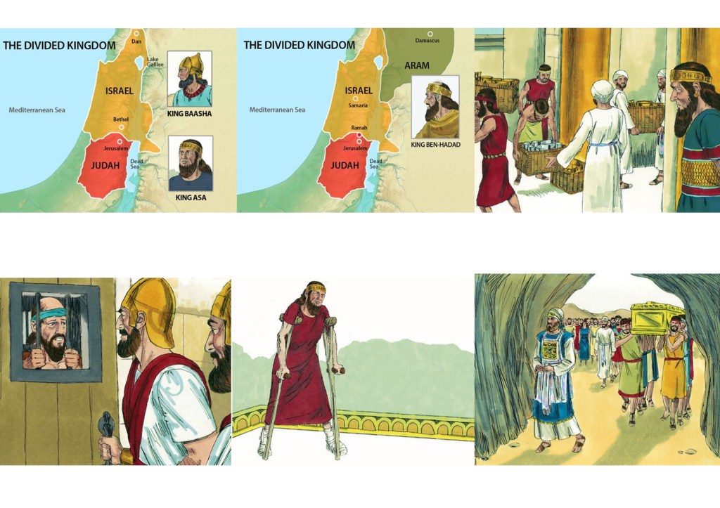 It seems all went well until 36 years into Asa’s reign. The conflict between the northern and southern kingdoms that began under Jeroboam and Rehoboam continued and reached a high point when Israel under its king, Baasha, created an embargo such that people could not enter or leave Judah, and he did so in alliance with neighbouring Aram (Syria) under its king, Ben-Hadad. Unlike before when Judah was attacked when he called on the Lord to help, Asa took treasure from the Temple and gave to Ben-Hadad as a bribe to switch sides. The move worked, but at a cost. The Lord sent Hanani, a prophet, to rebuke Asa, and tell him as a result of his foolishness he will be at war. For his pains, Hanani was imprisoned and Asa also began to oppress some of his own people. 3 years later, Asa was afflicted with a severe disease in his feet and, notably, he did not seek the Lord. When he did die, Asa was given a splendid funeral but there was no indication he repented of his foolishness. Even so, he did leave a worthwhile legacy, for it was said of his son, Jehoshaphat, who followed Asa as king: “In everything he followed the ways of his father Asa and did not stray from them; he did what was right in the eyes of the Lord” 1Kings 22:43.
