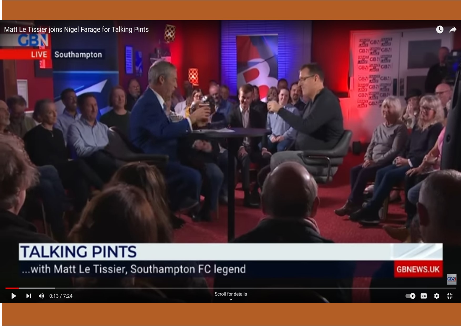I recently watched a 7-minute video: “Matt Le Tissier joins Nigel Farage for Talking Pints”, which packed a lot in and showed refreshing insights you won’t see in mainstream media from two heroes of mine. Both rightly question the official narrative and are unafraid to say so, resulting in considerable flak dished out by the “Unholy Trinity”, who continue to dumb down the public.