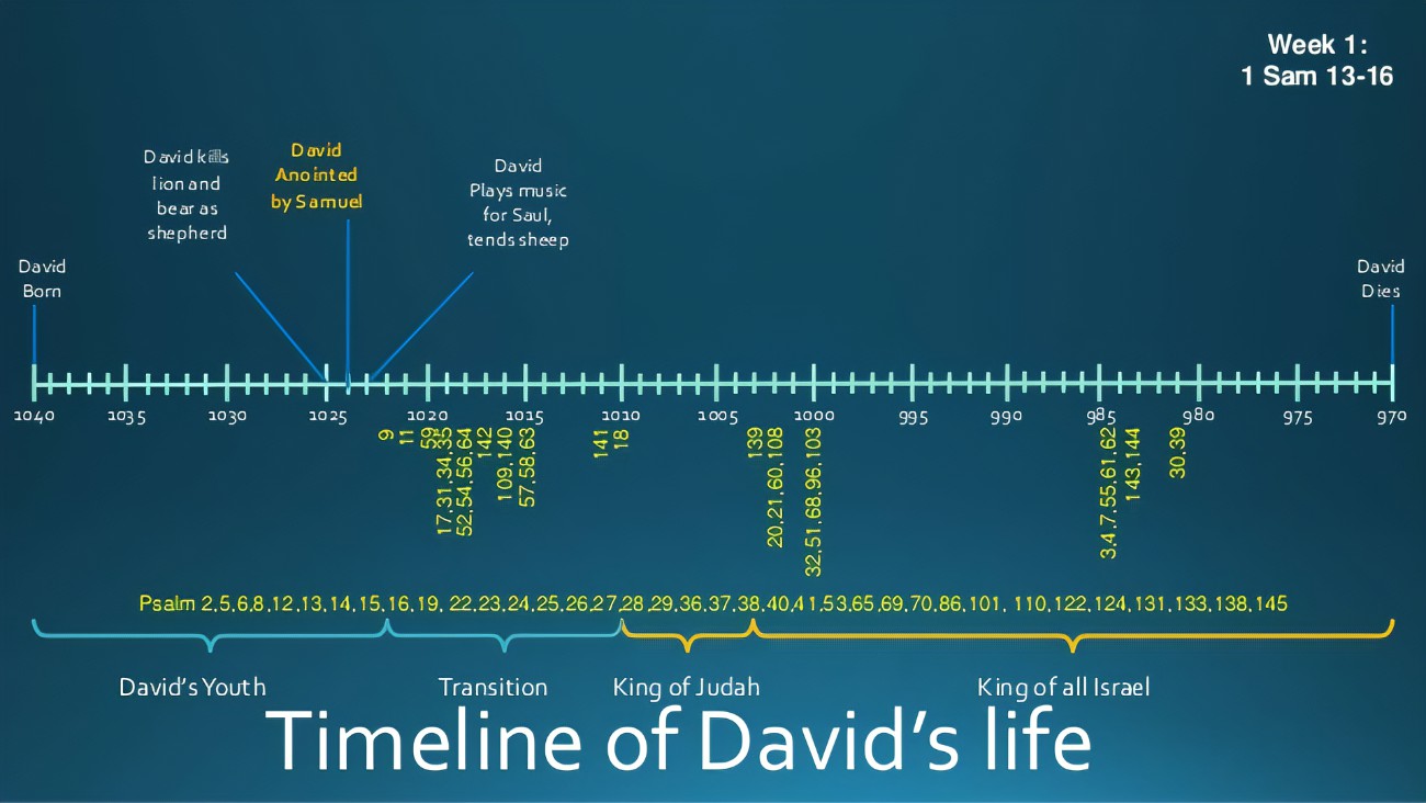 There was a further period of sometimes bloody civil war between the houses of Judah (David’s house) and of Israel (supporting the house of Saul) before David was crowned king, and all this time David’s character was being refined, during which he began to win battles to secure Israel’s borders etc. What we have seen thus far in our story of David is illustrative of how God deals with the people He chooses and the need for them to be patient and faithful.
