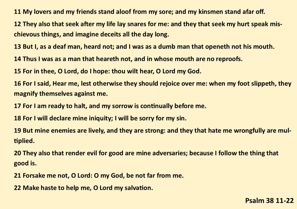 The Lord works in mysterious ways, for just prior to publishing this episode, a friend posted on his Facebook page concerning Psalm 38. While we cannot be certain of the circumstances concerning and the timing when this Psalm was written, it seemed to me that the events that were alluded to in the Psalm were consistent with what we know happened during this period of David’s life, when it came to his betrayal by friends, attacks by enemies and enduring trials and tribulations, part brought on by his own sin and folly. Yet he put his trust in the Lord, confident that God will help and not forsake him.