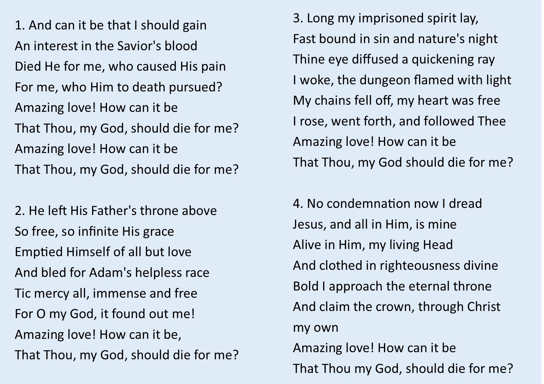 What would any hymn collection be without a contribution from the greatest hymn writer of them all, Charles Wesley? This one shows the wonder felt when a man discovers Christ and is full of depth.