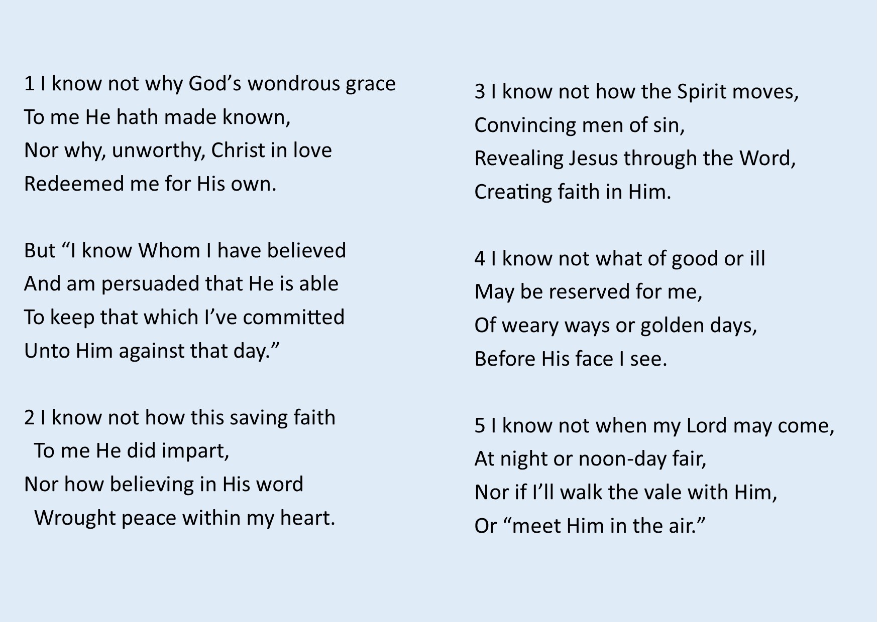 This popular, often sung, hymn includes the testimony of one who knew what it was to be enslaved because of sin and then to be saved by sovereign grace and to go on and live and die in that grace.