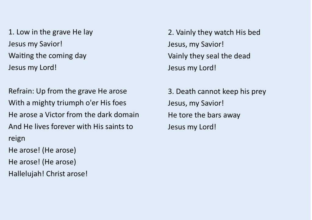 There are many great Easter hymns and this one, typically sung on Easter day, is a great reminder that Jesus who paid the ultimate price in order to redeem sinners triumphed victorious over death.