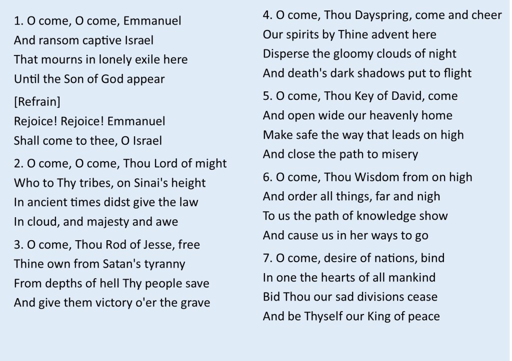 There are many hymns / carols sung the few weeks before Christmas but this, while strictly an Advent hymn, with its haunting tune and profound prophetic message, this is my favourite.