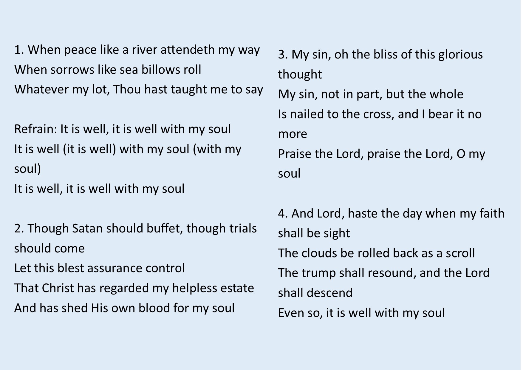 The writer of this hymn experienced enormous tragedy in his family life and yet could maintain his confidence in God despite it all and to go on and declare “it is well with my soul”.