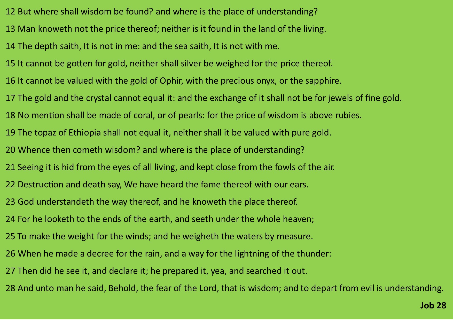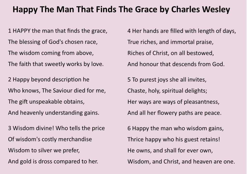 In conclusion, we simply affirm what became clear in chapter 28. True wisdom is highly desirable and something that we do well to seek after. It is not something that can be found through the natural world or in searching out the hidden depths of the earth where much that is of value can be found. It begins with the fear of God and humbly recognising how little we know. It is not for us to speculate with certainty on some of these weighty matters, like the reasons for suffering. Wisdom is a gift of God to those who fear him. Let us end with the words of a hymn by Charles Wesley based on this very chapter. He uses the word “happy” (meaning blessed) three times in the hymn, the third time stating what follows when “The Fear Of The Lord Is The Beginning Of Wisdom” truly applies:
