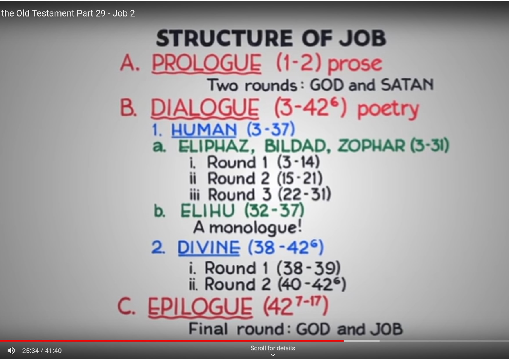 In order to cut to the chase, at the end, I refer readers to a helpful way of breaking down the Book of Job and a summary of Job the man (taken for my book: “Prophets of the Bible”). As for the Book of Job, I became familiar with it as a young Christian and, while I could see what were its main themes and the parts played by its main characters, I confess the unusual way the Book unfolds, dominated by discourses of a more philosophical nature, especially concerning suffering, between Job and his “friends”, enshrined in beautiful poetry, makes having a deeper understanding a challenge and one few preachers have risen to particularly well when it comes to presenting how arguments unfold and specific points made.