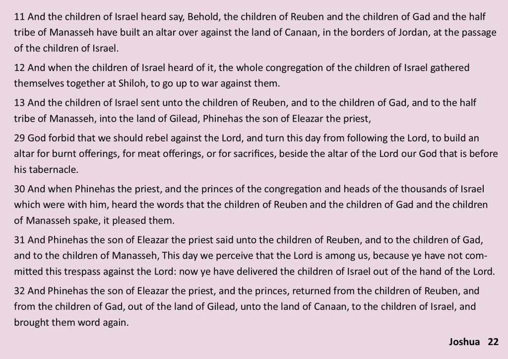 The obvious lesson we can draw from the life of Phinehas is the importance of zeal for God. One of his important jobs at the time he summarily executed the two high ranking lovers and thereby put an end to God’s plague of judgment was that of a doorkeeper at the Tabernacle. Centuries later, we are told: “In earlier times Phinehas son of Eleazar was the official in charge of the gatekeepers, and the Lord was with him” 1 Chronicles 9:20. The couple had violated the sanctity of that sacred area and it caused him to be righteously indignant for the Lord and take on implementing the remedy in the harshest of ways, something no-one else did, including Moses and Eleazar. Zeal can be misplaced for laudable reasons. Some of the 26 Bible usages are to do with misdirected zeal, e.g. Paul before his conversion. Understandably, many today are suspicious and wary when they come across people particularly zealous (often an attribute of those dealing judgment or terror in the name of religion). In the Joshua account, this is what Phinehas almost did, but when he found what was a right understanding, by listening to what others had to say, he did the right thing. Zeal rightly exercised (e.g. in doing good works) is to be commended!