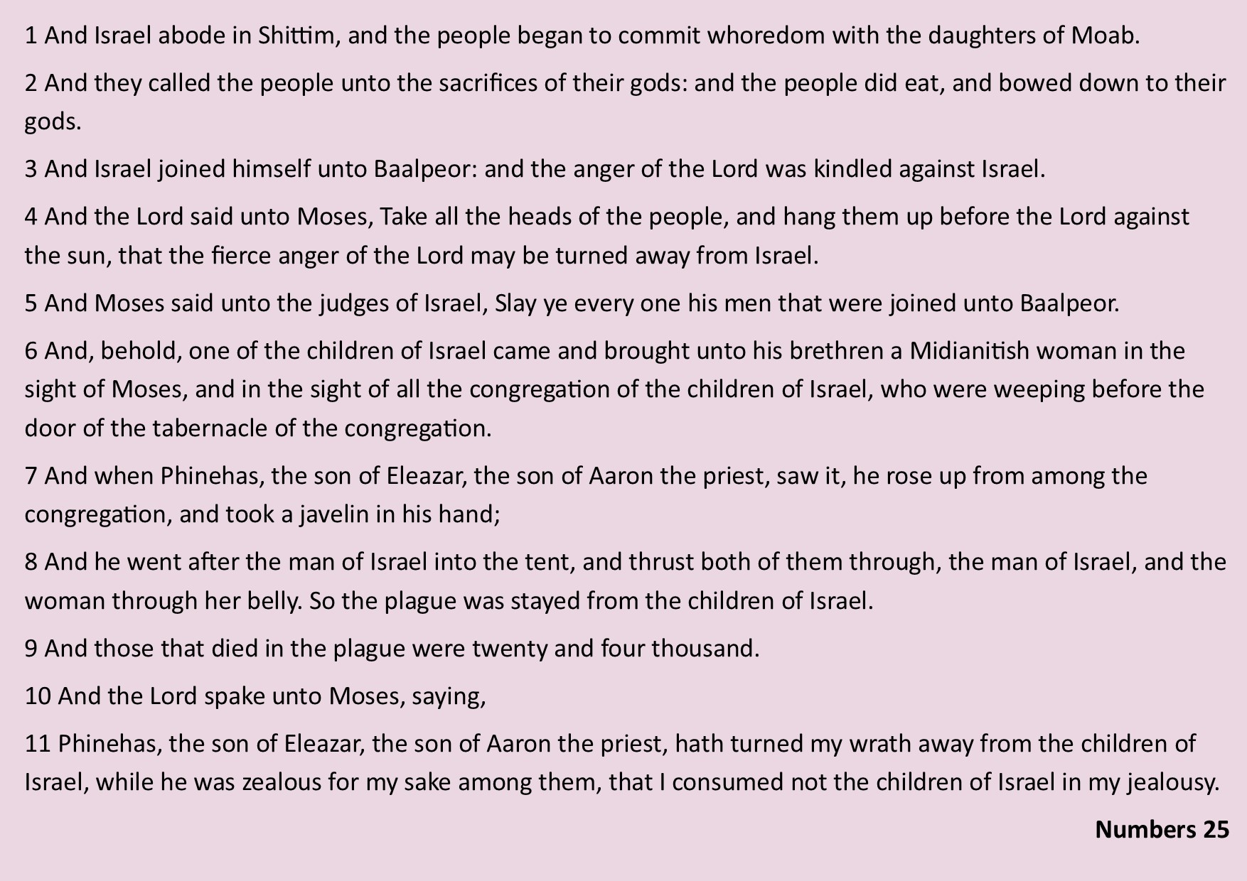 According to Wikipedia: “Phinehas was the grandson of Aaron and son of Eleazar, the High Priests (Exodus 6:25). He distinguished himself as a youth at Shittim with his zeal against the heresy of Peor. Displeased with the immorality with which the Moabites and Midianites had successfully tempted the Israelites (Numbers 25:1–9) to inter-marry and to worship Baal-peor, Phinehas personally executed an Israelite man and a Midianite woman while they were together in the man’s tent, running a javelin or spear through the man and the belly of the woman, bringing to an end the plague sent by God to punish the Israelites for sexually intermingling with the Midianites. Phinehas is commended by God in Numbers 25:10-13, as well as King David in Psalms 106:28–31 for having stopped Israel’s fall into idolatrous practices brought in by Midianite women, as well as for stopping the desecration of God’s sanctuary. After the entry to the land of Israel and the death of his father, he was appointed the third High Priest of Israel, and served at the sanctuary of Bethel (Judges 20:28)”.