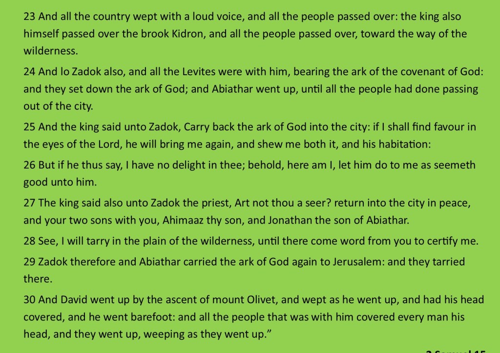 Zadok, which appropriately means “righteous”, “just”, traces his ancestry back to Aaron, through Eleazar and Phineas (all discussed earlier) and from what we can work out High Priests that followed him, until after the return of the Exile with later infiltration of Greeks and Romans were descendants of Zadok. Zadok first appears on the scene while David was exiled but was soon to take the Throne, upon Saul’s death: “And these are the numbers of the bands that were ready armed to the war, and came to David to Hebron, to turn the kingdom of Saul to him, according to the word of the Lord … And Zadok, a young man mighty of valour, and of his father’s house twenty and two captains” 1 Chronicles 12: 23,28.