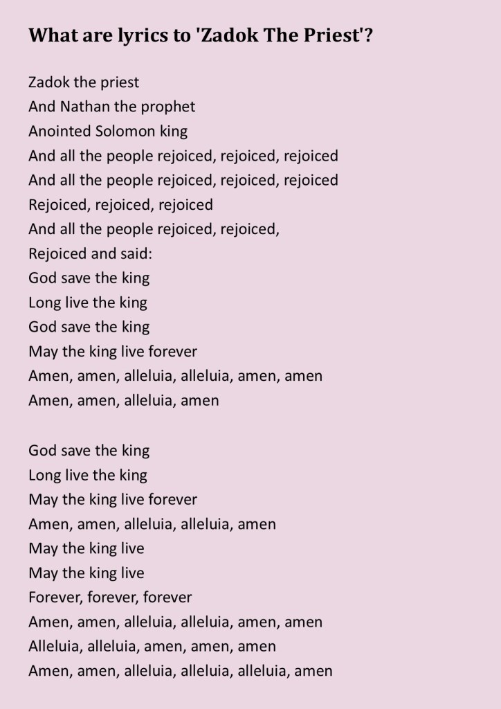 As I write this, my fellow countrymen anticipate the coronation of King Charles III in less than two months’ time. One of the anthems we expect to be played during that event is “Zadok the Priest” (see here for a rendition, and above for lyrics). According to Wikipedia: “Zadok the Priest is a British anthem that was composed by George Frideric Handel for the coronation of King George II in 1727. Alongside The King Shall Rejoice, My Heart is Inditing, and Let Thy Hand Be Strengthened, Zadok the Priest is one of Handel’s coronation anthems. One of Handel’s best-known works, Zadok the Priest has been sung prior to the anointing of the sovereign at the coronation of every British monarch since its composition and has become recognised as a British patriotic anthem. Part of the traditional content of British coronations, the texts for all four anthems were picked by Handel—a personal selection from the most accessible account of an earlier coronation, that of James II in 1685. The text is a translation of the traditional antiphon, Unxerunt Salomonem, itself derived from the biblical account of the anointing of Solomon by the priest Zadok (1 Kings 1:38-40). These words have been used in every English, and later British, coronation since that of King Edgar at Bath Abbey in 973”.