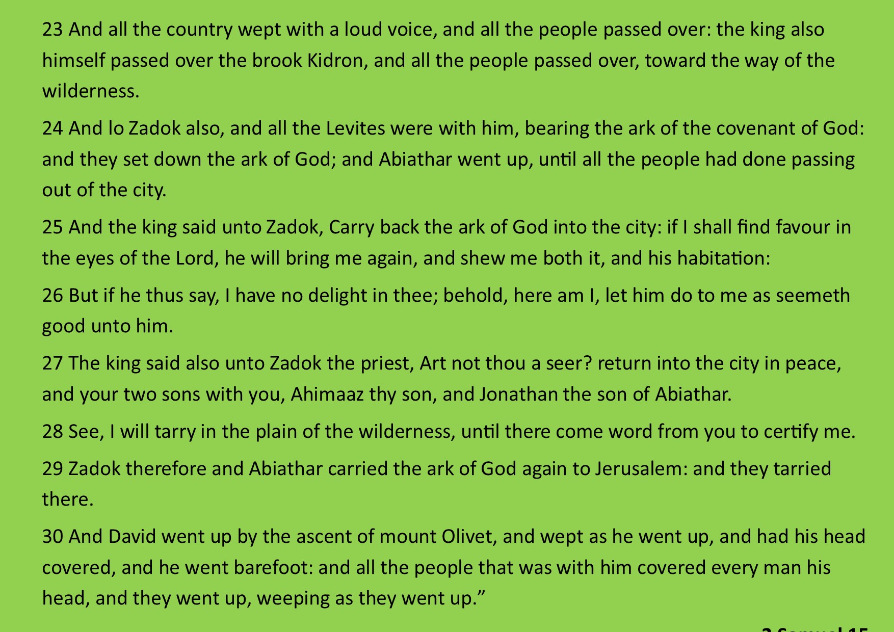 Zadok, which appropriately means “righteous”, “just”, traces his ancestry back to Aaron, through Eleazar and Phineas (all discussed earlier) and from what we can work out High Priests that followed him, until after the return of the Exile with later infiltration of Greeks and Romans were descendants of Zadok. Zadok first appears on the scene while David was exiled but was soon to take the Throne, upon Saul’s death: “And these are the numbers of the bands that were ready armed to the war, and came to David to Hebron, to turn the kingdom of Saul to him, according to the word of the Lord … And Zadok, a young man mighty of valour, and of his father’s house twenty and two captains” 1 Chronicles 12: 23,28.