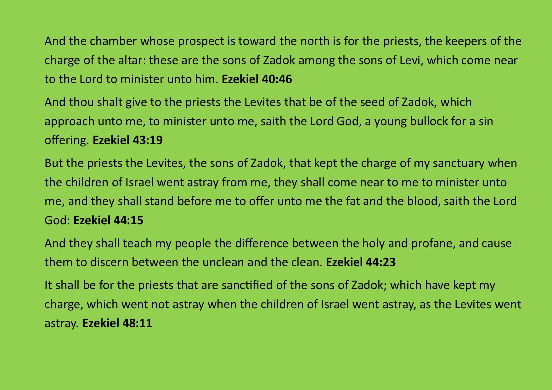 As part of researching Zadok, there are several helpful videos and articles. One I will draw attention to that particularly impacted me is titled: “Zadok and Abaithar Priesthoods – David Wilkerson” (see here). Wilkerson makes the distinction between these two anointed priests but the former, Abiathar, losing that anointing evidenced by his actions siding with Adonijah, the unrighteous candidate, in the matter of the kingly succession, whereas Zadok making the righteous choice and maintaining that anointing as evidenced by the Ezekiel references. His point is that many a Christian leader (and he included himself) can begin well and used by God but fall away from being blessed by God through sin. Unlike Abiathar, Zadok continued in the blessing. In another sermon, “A Remnant Priesthood (David Wilkerson)”, he argues that God is seeking such among His people today, a righteous remnant, a holy people, who function in the Zadok mold.