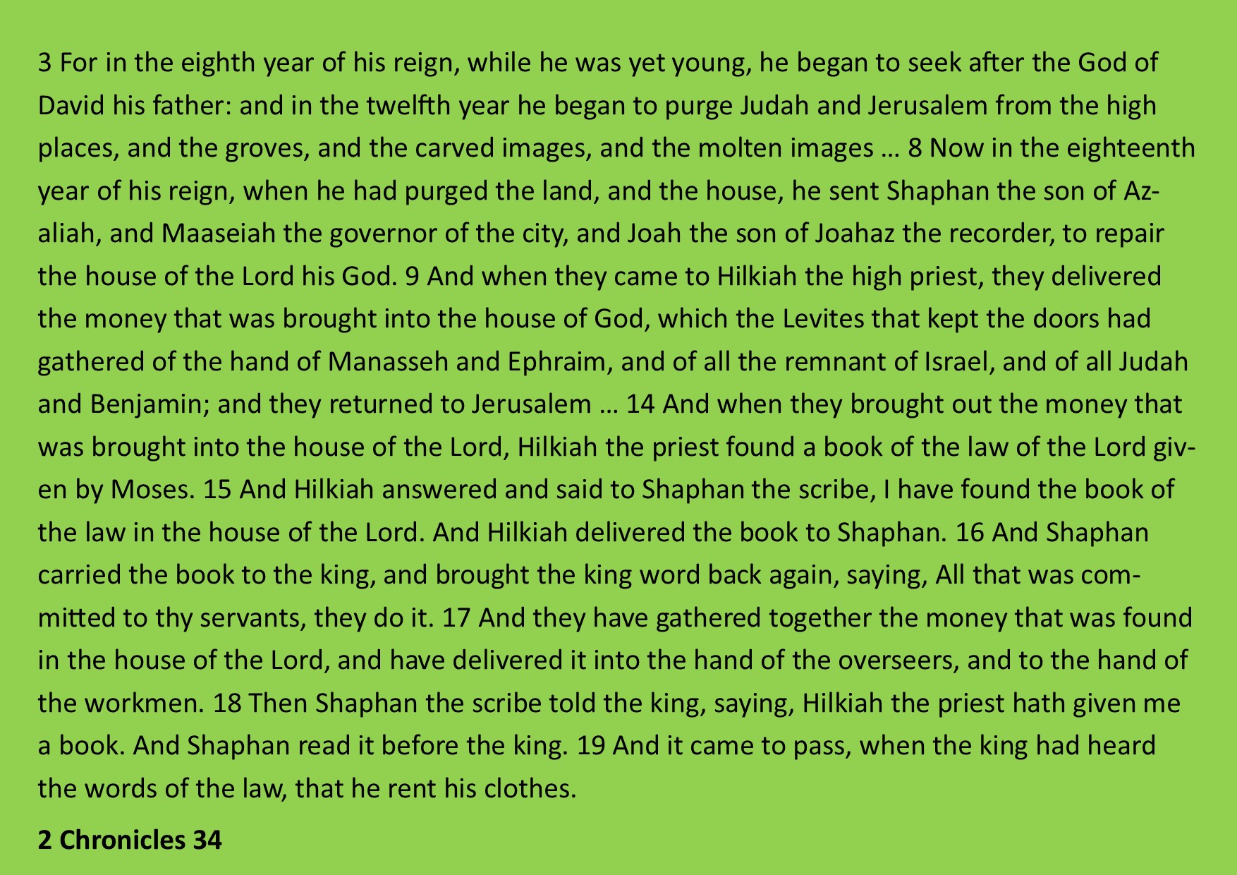 Also, as with the Azariah significant story, the main character, or at least the one people who do know it, remember, is not a priest but a king, in this case King Josiah, the last good king of Judah. Josiah followed two bad kings: Manasseh and Amon that left the land in a sorry state, and after him was followed by Jehoahaz, Jehoiakim, Jehoiachin and Zedekiah, after which there was no more kings and the Exile of Judah to Babylon. We read the story, which is but part of the Josiah record, in 2 Kings 22 and 2 Chronicles 34. Both begin with words to the effect: “Josiah was eight years old when he began to reign, and he reigned in Jerusalem 31 years and he did that which was right in the sight of the Lord,” and continue to give an account of his good works that back up this statement.