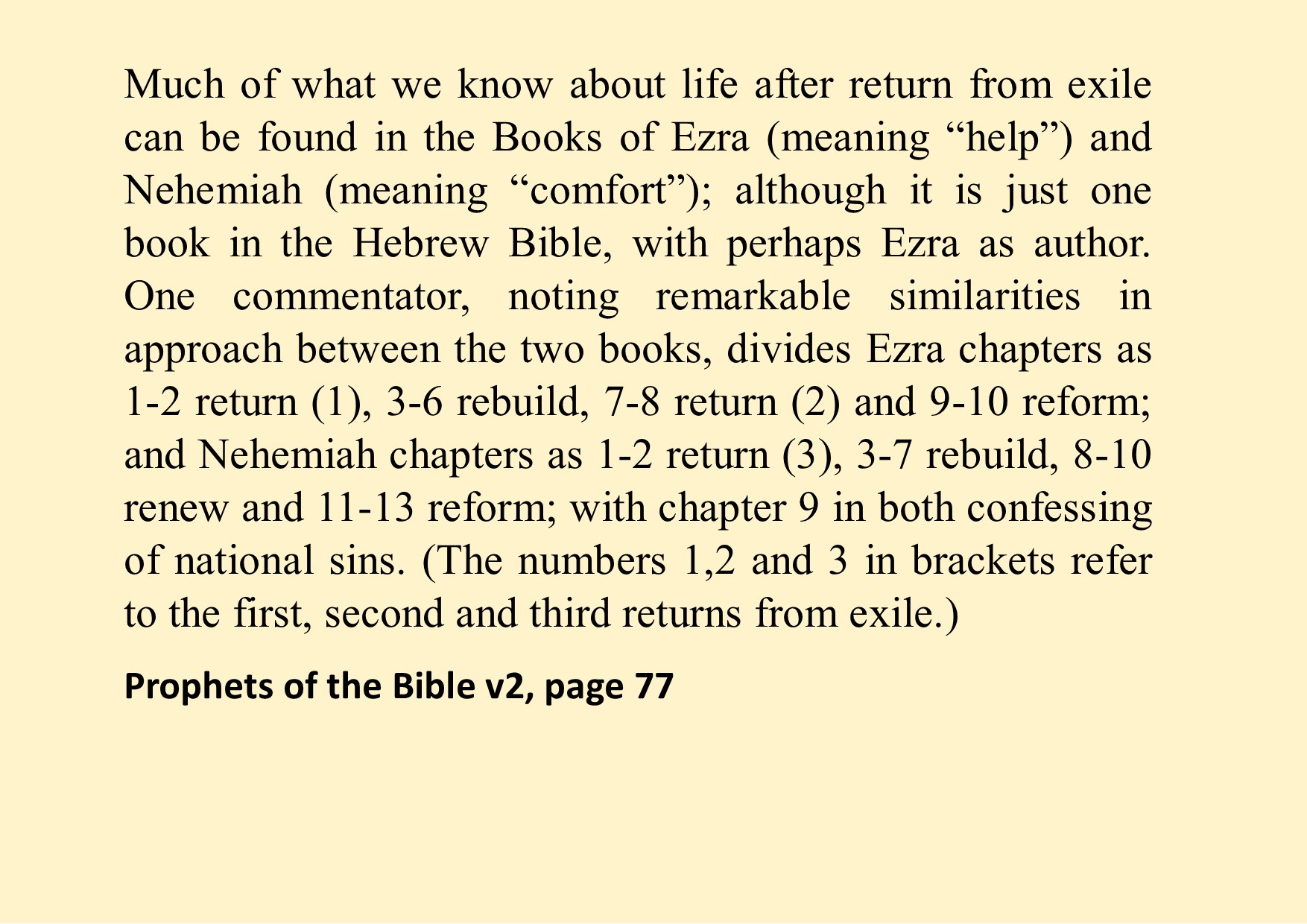 Ezra is somewhat different in what he did compared with other priests, although he was certainly qualified by virtue of tracing his ancestry to Aaron. It is worth noting that in line with the observation that the Bible is primarily about God and His dealings with humankind, while Ezra is mentioned by name in the two books (Ezra and Nehemiah) it is said he had written (with a third, the Book of Chronicles he may well have written), more important is God, how He related to the Exiles and how the Exiles responded to Him, who had returned home following the Babylonian captivity. He stands out, not because of his direct contribution to Temple worship but as a scribe, teacher, organiser and someone who was zealous that YHWH be honoured in the right way. Regarding the background to where Ezra fits into the Bible narrative, I include two extracts (above) from my “Prophets of the Bible” book (see here).