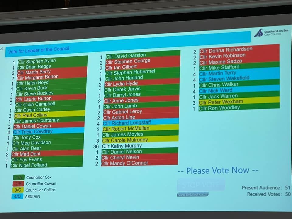 I am grateful to one of my trusted informants for sending me the breakdown of who voted for who to lead the Council … and found there were surprises and something I wrote I needed to correct. Interestingly enough, all the candidates in the Independent Group (Martin Terry, Stephen Wakefield and Nick Ward) abstained. Except for Tricia Cowdrey, who abstained, Ron Woodley and Mike Stafford of Residents First voted for Tony Cox. The other Independent, Stephen Aylen, also voted for Tony Cox. Kathy Murphy did not vote. Richard Longstaff, Southend’s first Green councillor, abstained.