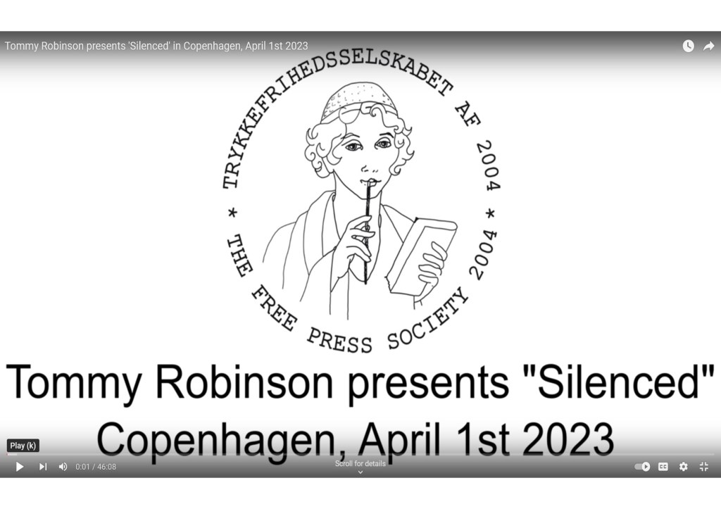 It was over five years ago when I wrote my “Tommy Robinson, Speakers Corner and the Time to Speak” blog and still the issues and concerns I raised then apply, and so do my views on Tommy. I am grateful to one of my Telegram contacts for sharing a link to a 45-minute video, titled: “Tommy Robinson presents ‘Silenced’ in Copenhagen, April 1st 2023” which reveals what was said when he was invited to Christiansborg Palace in Copenhagen by the Danish People’s Party and The Free Press Society to premiere his new documentary ‘Silenced’. It was refreshing to see people in a country I know little about asking what I consider to be the right and important questions with Tommy giving more than satisfactory responses. Then there was the “‘SILENCED’ UNEDITED │ BANNED Film” he produced.