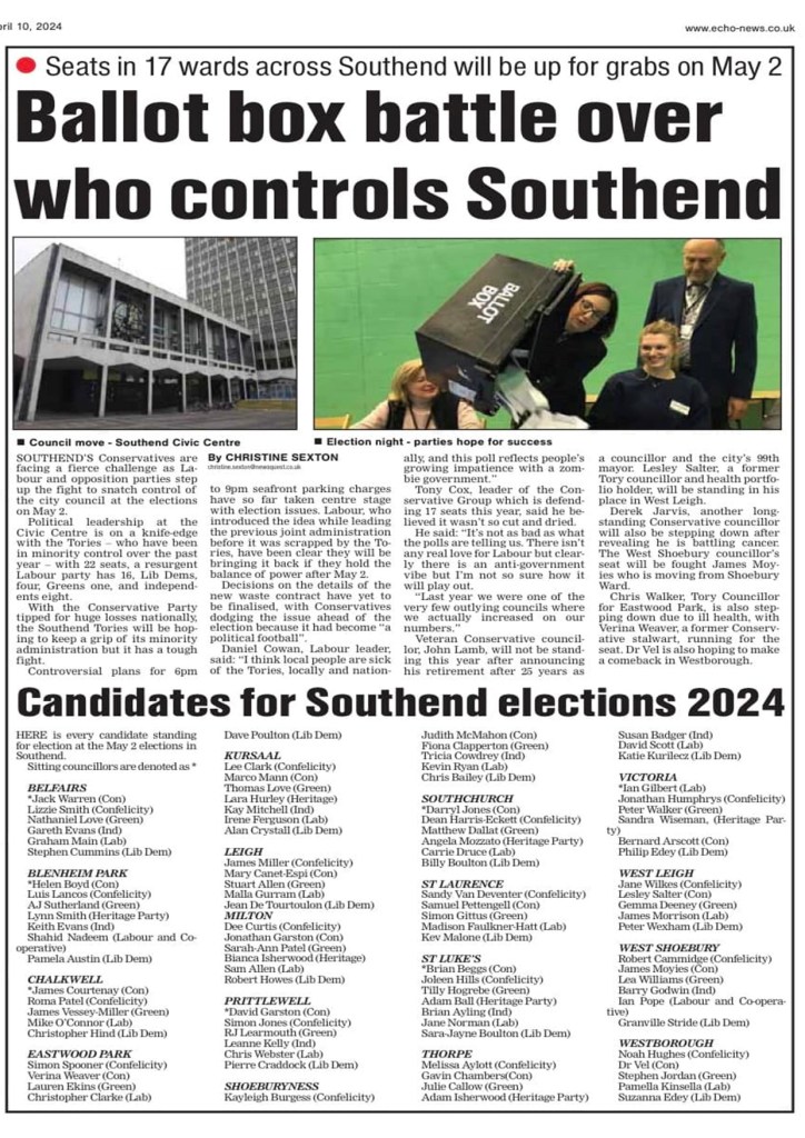 I confess, that this time round I have taken minimal interest in the forthcoming elections, especially when comparing with recent years. Then yesterday I got sight of the Southend Echo report on the subject that it included who is standing in each of the thirteen wards. My interest was aroused, not least because I know a number of the candidates and I have also been a lifelong political junkie.