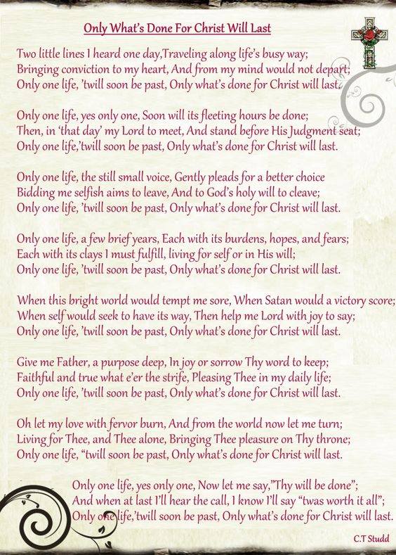According to Wikipedia: “Charles Thomas Studd, often known as C. T. Studd (2 December 1860 – 16 July 1931), was a British missionary, a contributor to The Fundamentals, and a cricketer. As a British Anglican Christian missionary to China he was part of the Cambridge Seven, and later responsible for setting up the Heart of Africa Mission which became the Worldwide Evangelisation Crusade (now WEC International). As a cricketer, he played for England in the 1882 match won by Australia, which was the origins of The Ashes. A poem he wrote, “Only One Life, ‘Twill Soon Be Past”, has become famous to many who are unaware of its author. Studd was a son of retired merchant Edward Studd. Edward became a Christian during a Moody and Sankey campaign in England, and a visiting preacher to the Studd home, Tedworth House in Wiltshire, converted C.T. and two of his brothers to the faith while they were students at Eton. According to his conversion narrative, the preacher asked him if he believed God’s promises to give believers eternal life, and as Charles would only go so far as to profess he believed Jesus Christ died, the guest pressed the point, and Charles then believed on the Lord Jesus for salvation. Charles later recalled the moment … On 16 July 1931, still labouring for the Lord at Ibambi at the age of seventy, Charles Studd died from untreated gallstones.”