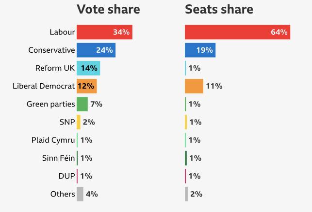 - (As predicted) the greater discrepancy between vote and seat share than that seen in previous elections, with Labour benefiting massively and Greens and especially Reform losing out