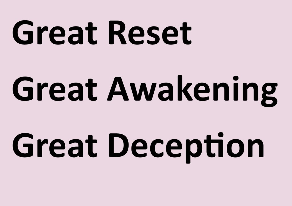 In the last couple of years, I have been torn between notions such as we are heading for a “Great Reset”, spoken about and lauded by the WEF and many world leaders, which could well usher in the reign of the AntiChrist, a “Great Awakening” when many will realise and stand up against what is really going on behind the scenes, led by an evil, elite cabal with an agenda to depopulate the planet and enslave those who remain, and according to some political prophets include a great spiritual revival based on authentic Christianity and a “Great Deception” that much of humanity and elements of the church have succumbed to, which Jesus warned would be the case in these end times with his “elect shall be deceived” prediction (Matthew 24:24).