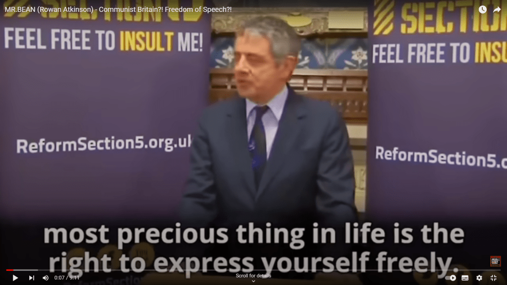 MR.BEAN (Rowan Atkinson) – Communist Britain?! Freedom of Speech?! Rather eloquently makes the point that after what sustains life itself, the freedom to express oneself is the most precious thing we possess and gives examples when people have fallen foul of them with the power for doing so.